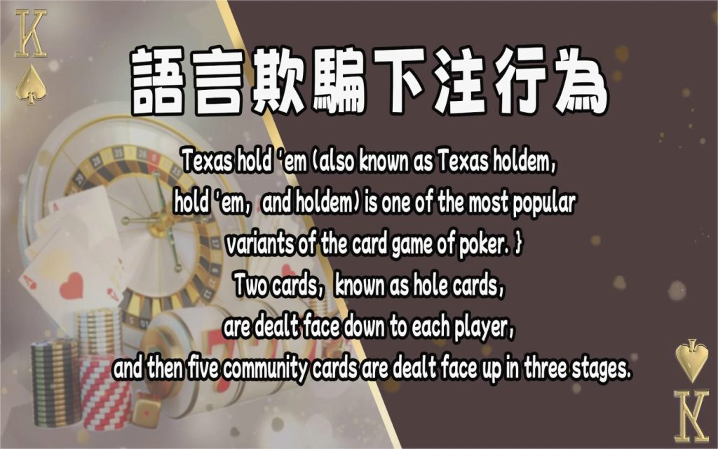 - 語言詭計:對手可能透過語言來有意引導你。舉例來說,他們可能宣稱手上的牌非常強,企圖嚇唬你。要留意這種語言詭計,並謹記不要輕易相信他人的話語。